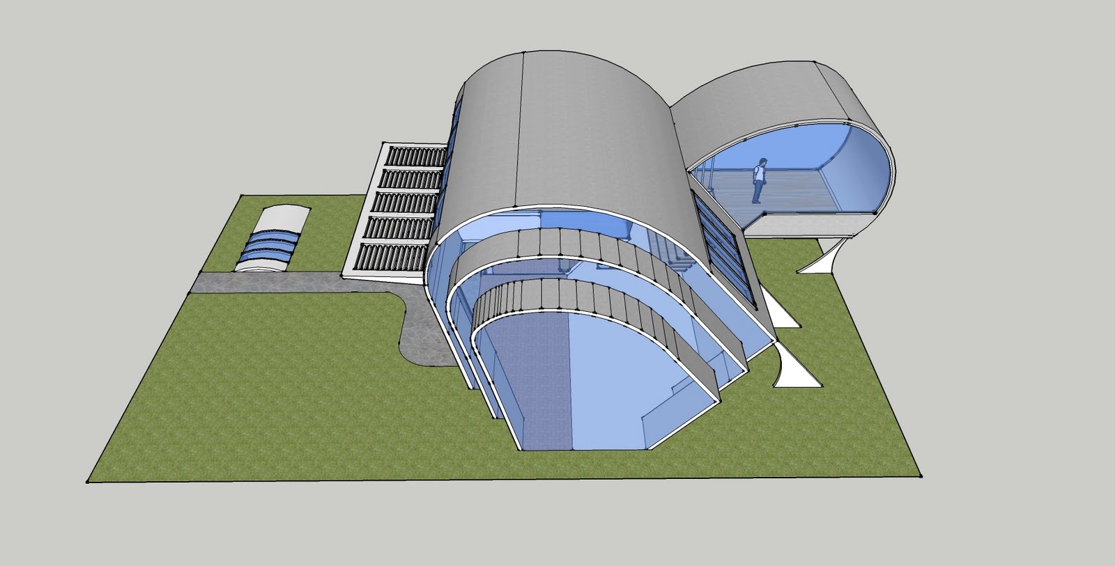 Sketch up model perspective 1. Exterior view. The designed was created around a "Datum" or zero ground level. The above ground is inspired by the word "Pulsating" and depicts the human organ system and is therefore very curvaceous and flowing. The below ground represents family structure and the heirachy that exists within a family.Sunday, March 7, 2010